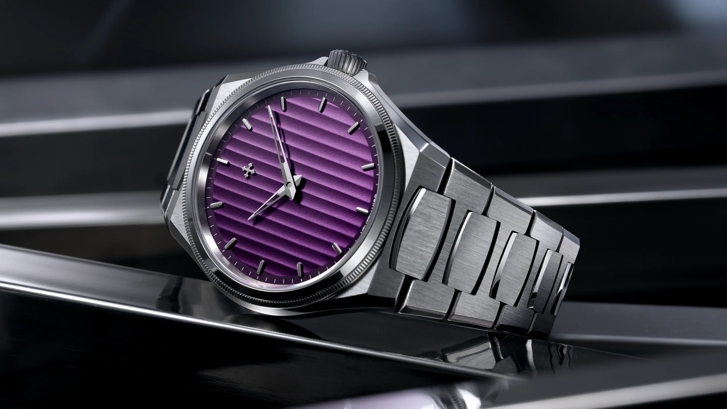 Parlatılmış kabartmalı bezel, dikey fırçalanmış finisajlarla birleşerek, onu çok yönlü ve ayırt edici bir saat haline getiriyor.