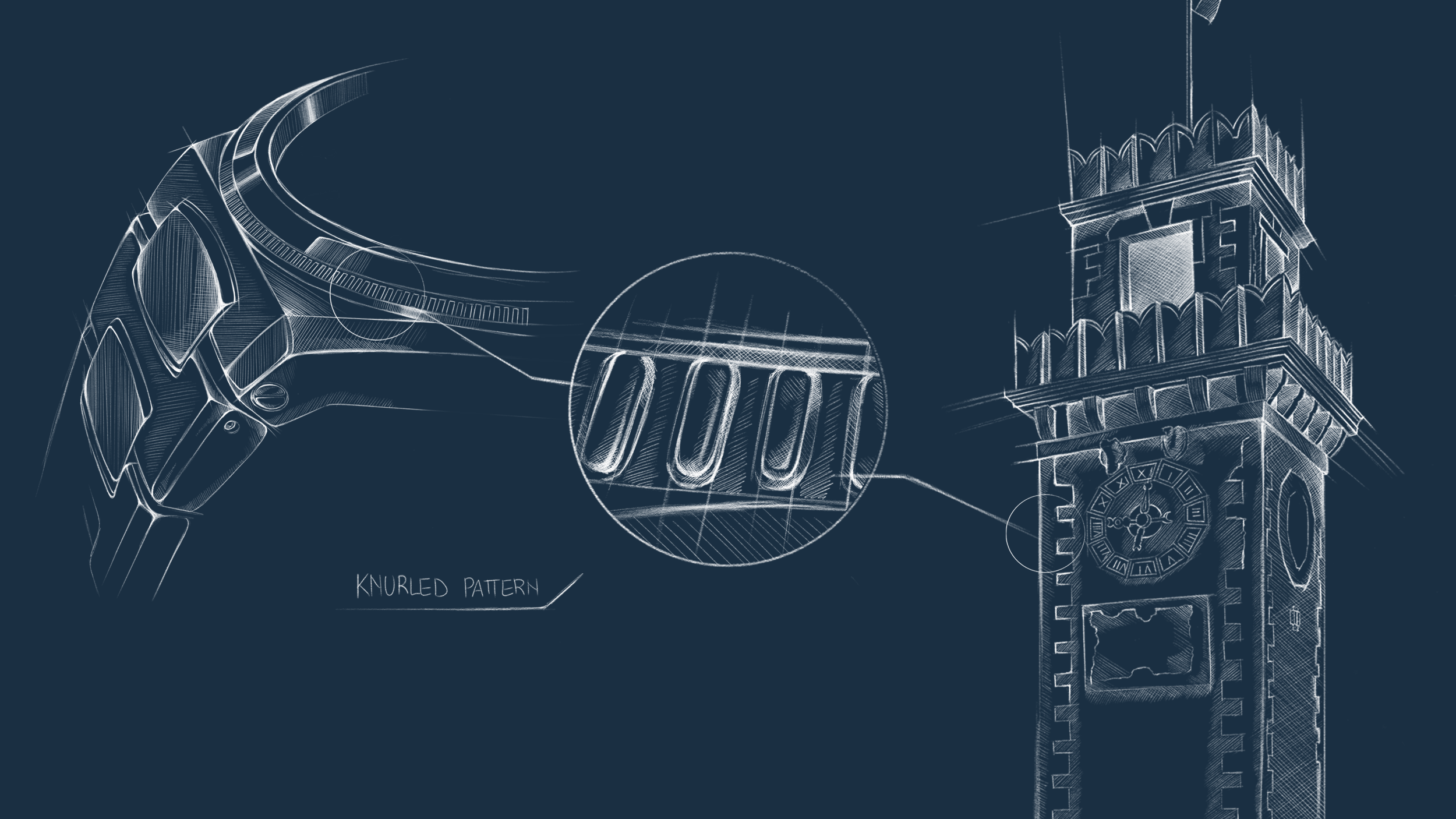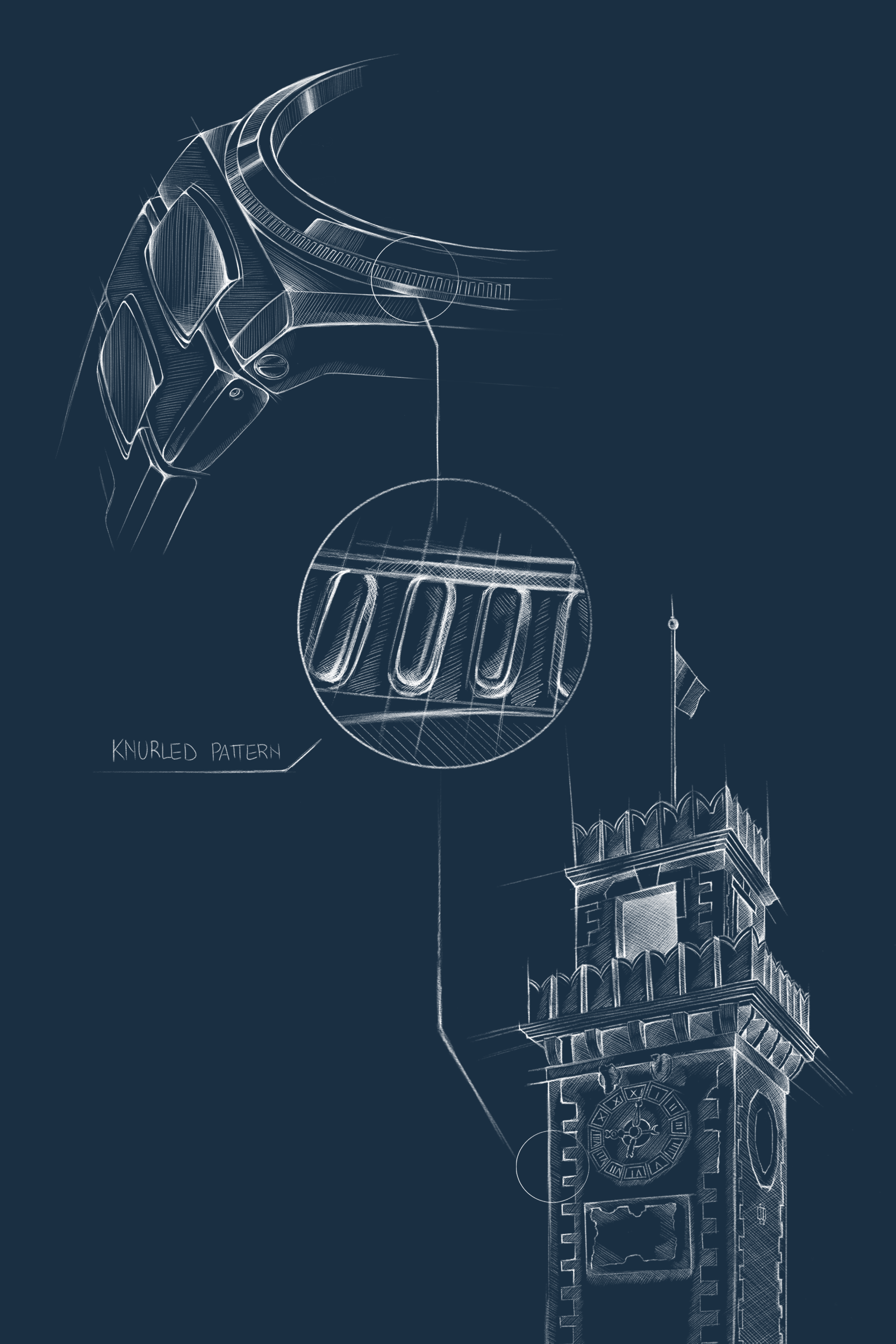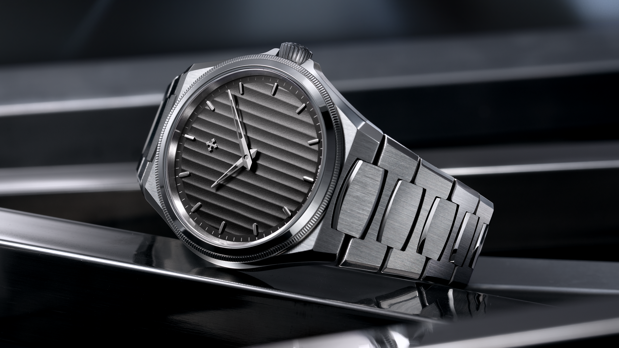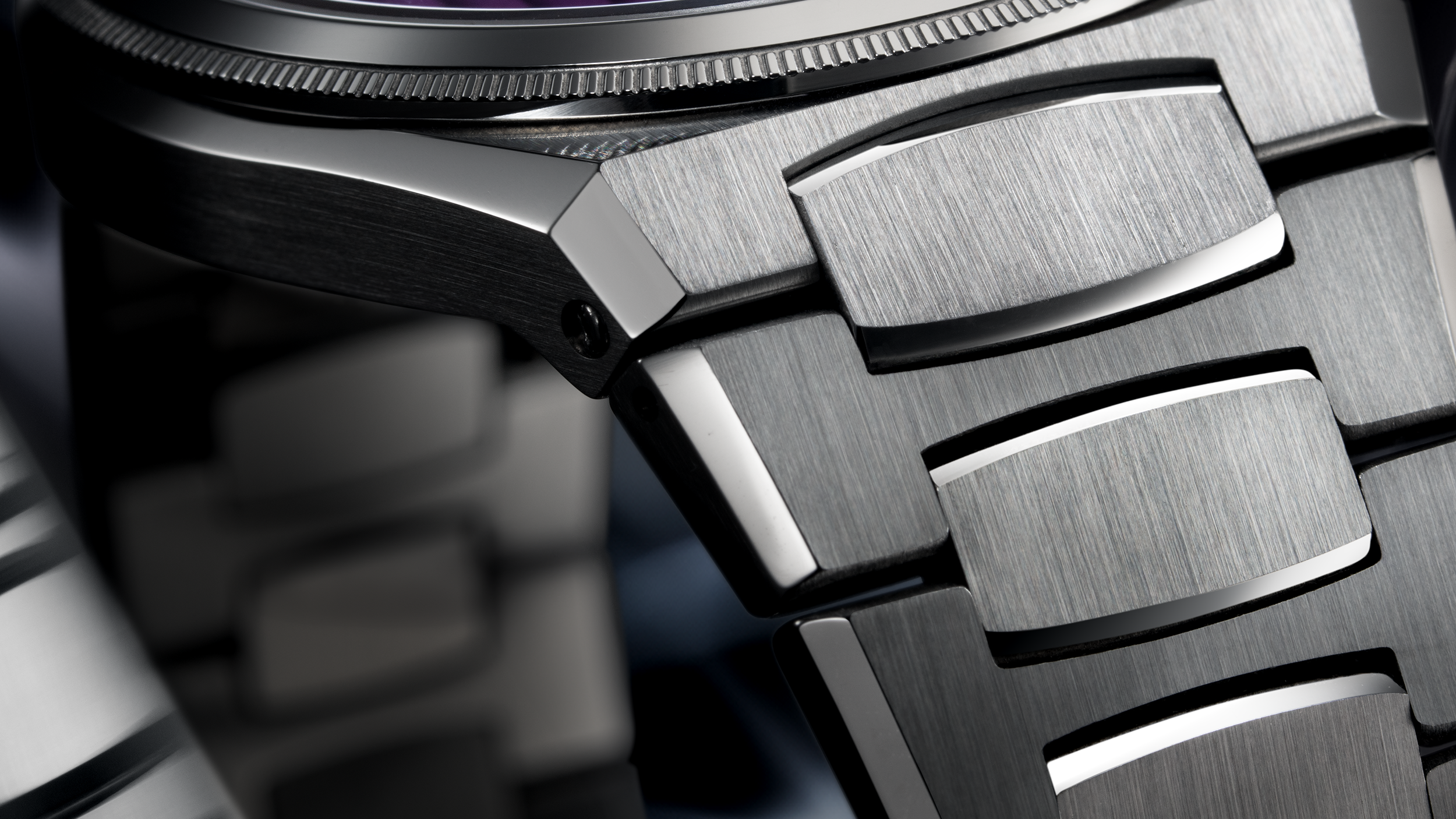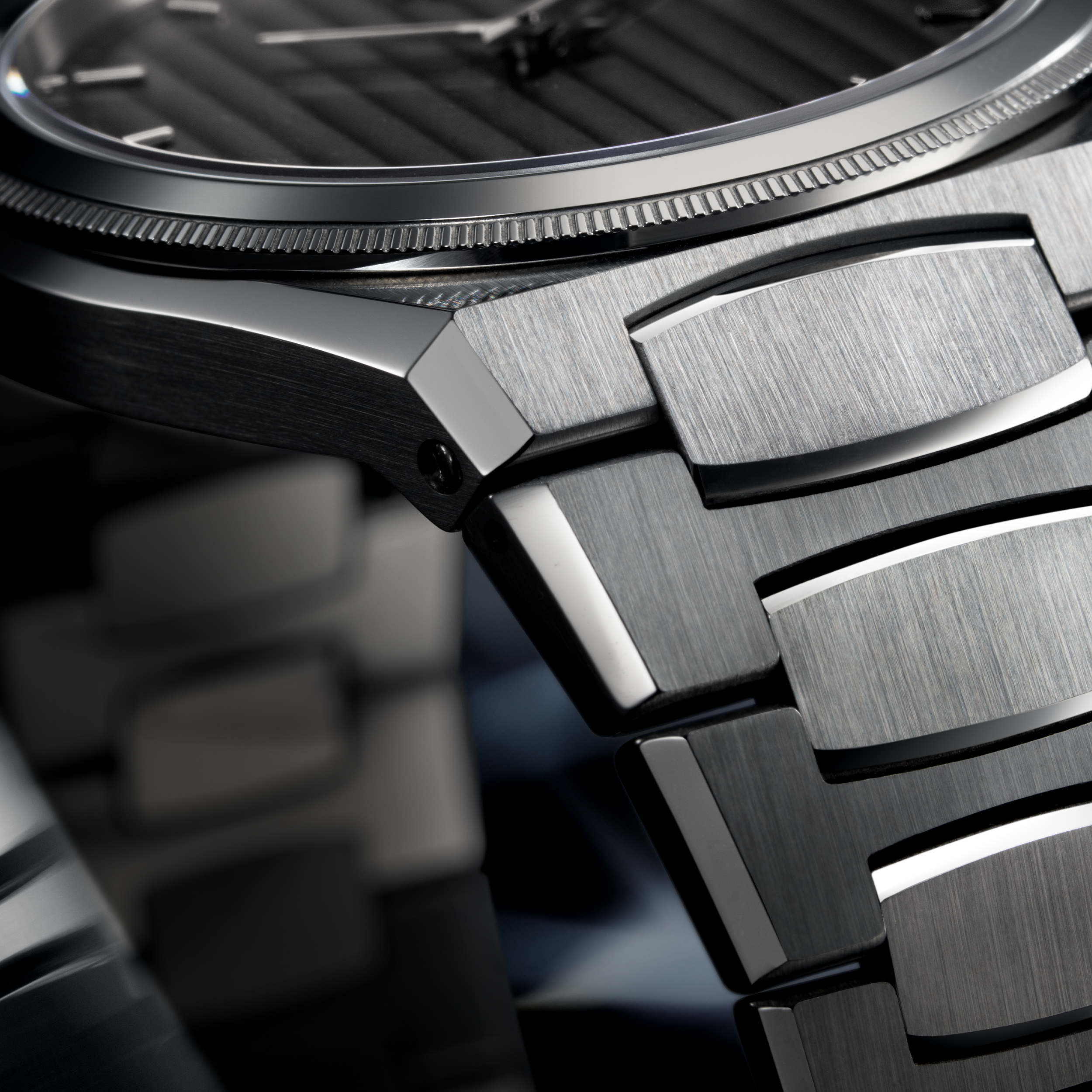 Parlatılmış kabartmalı bezel, dikey fırçalanmış finisajlarla birleşerek, onu çok yönlü ve ayırt edici bir saat haline getiriyor.