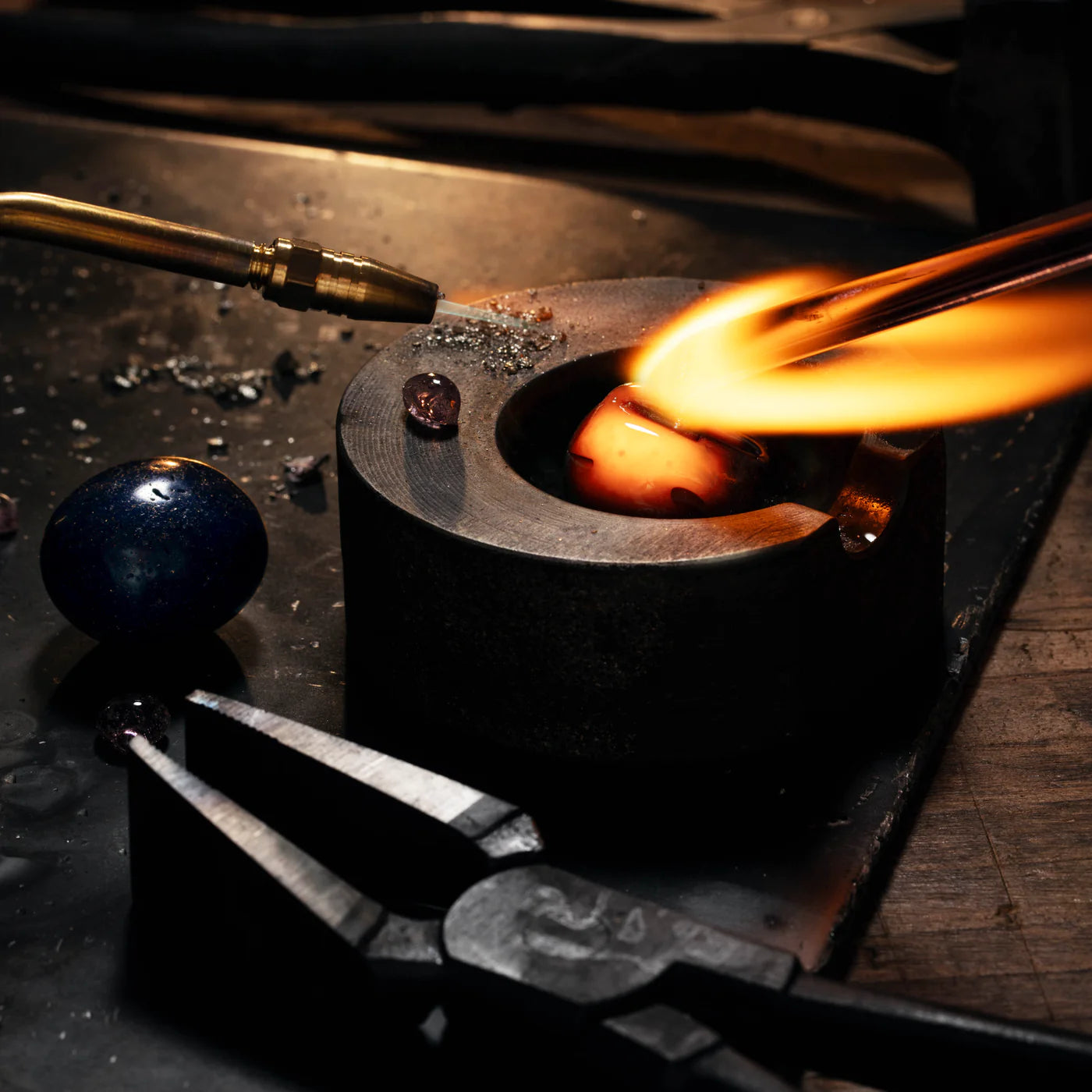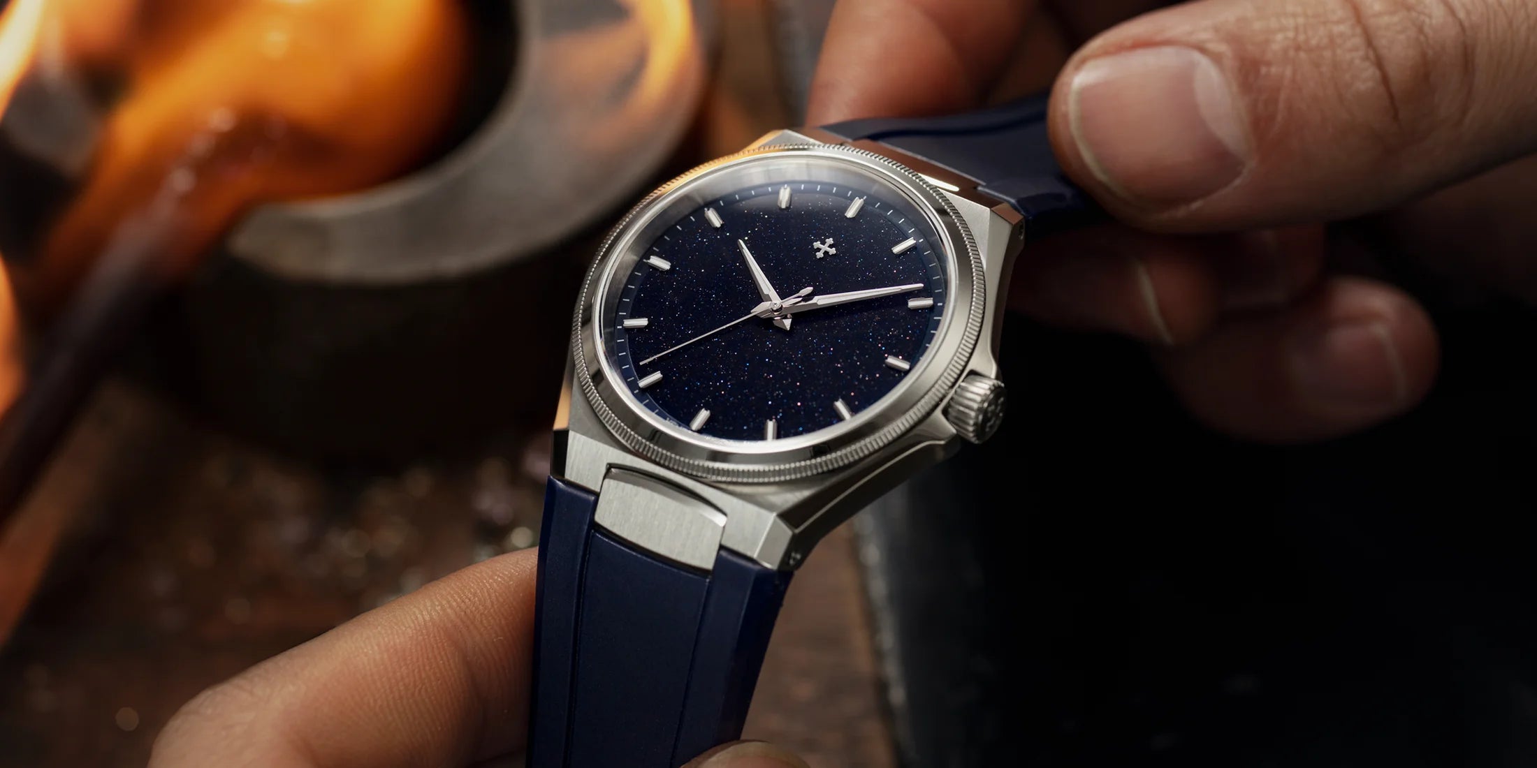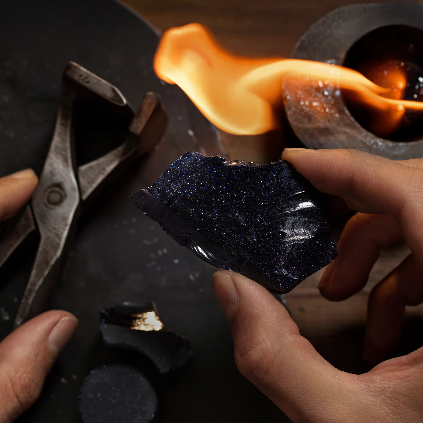 Aventurin, cam ustalığının bir ürünü olarak doğar; silika ve bakırın, son derece hassas şekilde kontrol edilen bir süreçte birleştirilmesiyle oluşur. Bu özel camın sırrı ise yavaş soğutma aşamasında gizlidir—bu sayede bakır, ışıldayan tanecikler hâlinde kristalleşir. Bu teknik yüksek düzeyde uzmanlık gerektirir; çünkü sıcaklıktaki en ufak bir değişim, elde edilecek sonucu doğrudan etkileyebilir. Cam kütlesi elde edildikten sonra, su jeti ile son derece hassas şekilde kesilerek, kadran üretimi için ideal incelikte diskler hâline getirilir.