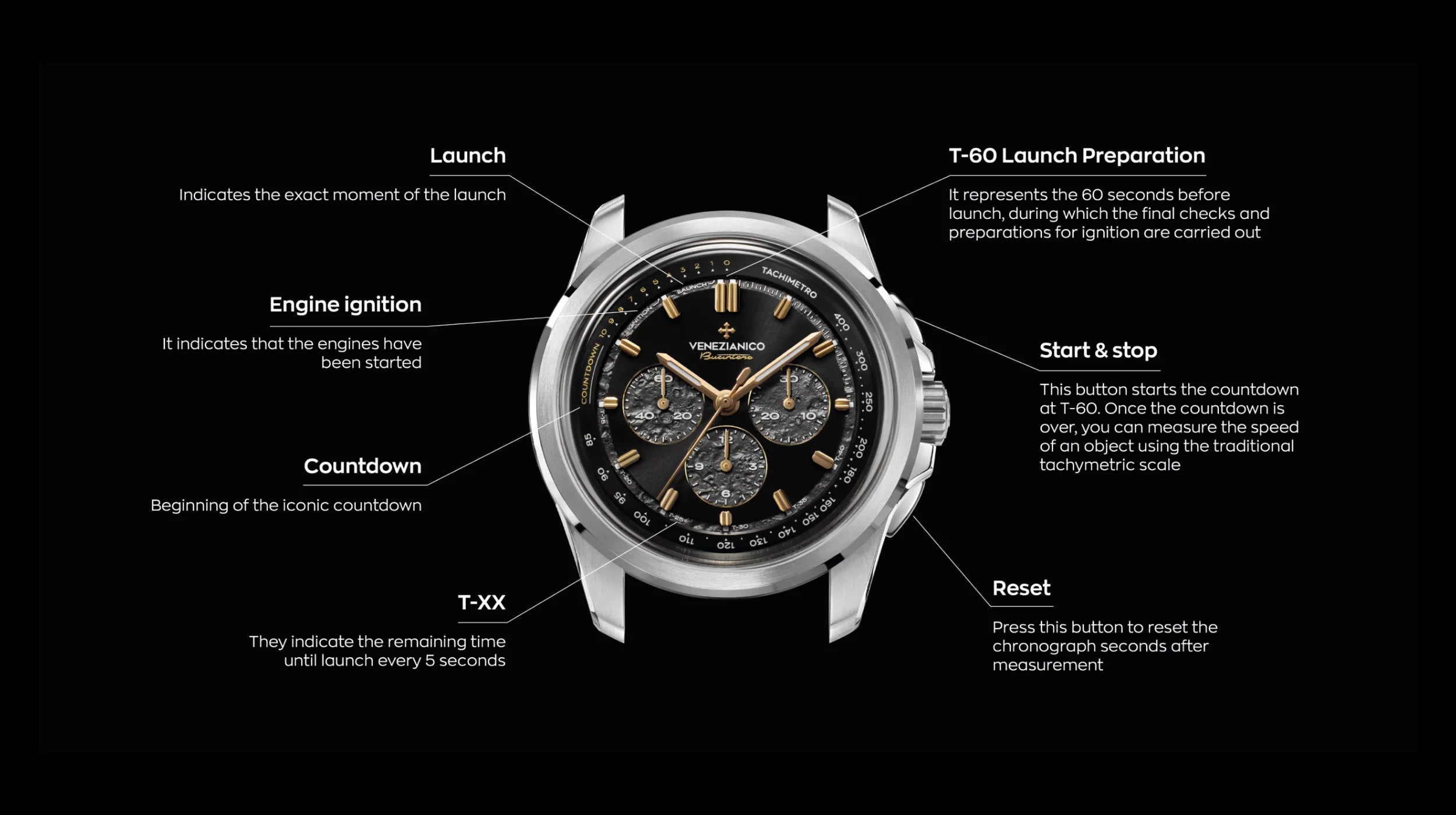 Bucintoro 1969, kendine özgü bir özellik olan geri sayım fonksiyonuyla birlikte gelir. Geri sayım, T-60’taki “Fırlatma Hazırlığı” ile başlar ve T-10 itibarıyla asıl geri sayım süreci devreye girer. T-5’te “Motor Başlatma” gerçekleşir ve ardından “Fırlatma” anı ile geri sayım sona erer. Sıfır noktasına ulaşıldığında kronograf, takimetre sayesinde hızı ölçmeye başlar. “Sıfırla” butonuna basıldığında ise kronograf yeni bir geri sayım dizisi için sıfırlanır.