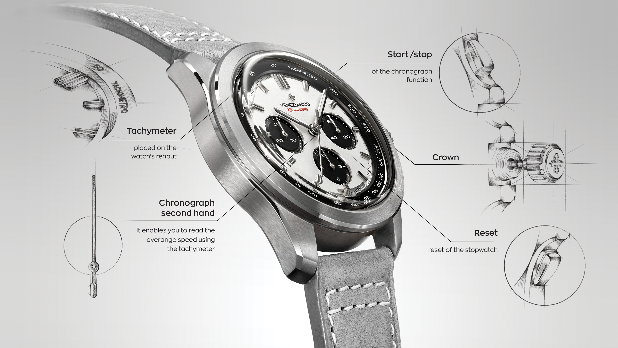Bucintoro, kronograf fonksiyonları için üç göstergeli bir yapıya sahiptir. Merkez miline bağlı olan kronograf saniye ibresi, aynı zamanda rehaut üzerinde yer alan takimetre ölçeği aracılığıyla (bir kilometrelik mesafe üzerinden) hız ölçümüne de imkân tanır. 9 yönünde bulunan 30 dakikalık kronograf sayacı, 3 yönündeki sürekli saniye sayacıyla kontrast oluşturur. Son olarak, alt kısımda yer alan üçüncü alt kadran saat ölçümünü gösterir.