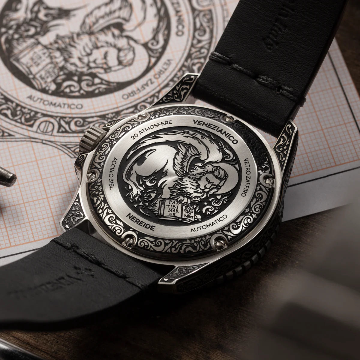 Nereide Acquaforte, Rönesans döneminin zarif akantus yapraklarından esinlenen ince gravürlerle süslenmiş kasasıyla öne çıkar. Minimalist siyah kadranı, parlatılmış indekslerle estetik ve işlevselliği dengeler. İndeksler ve kollar, düşük ışık koşullarında mükemmel okunabilirlik sağlayan Siyah İsviçre Super-LumiNova® ile kaplanmıştır.