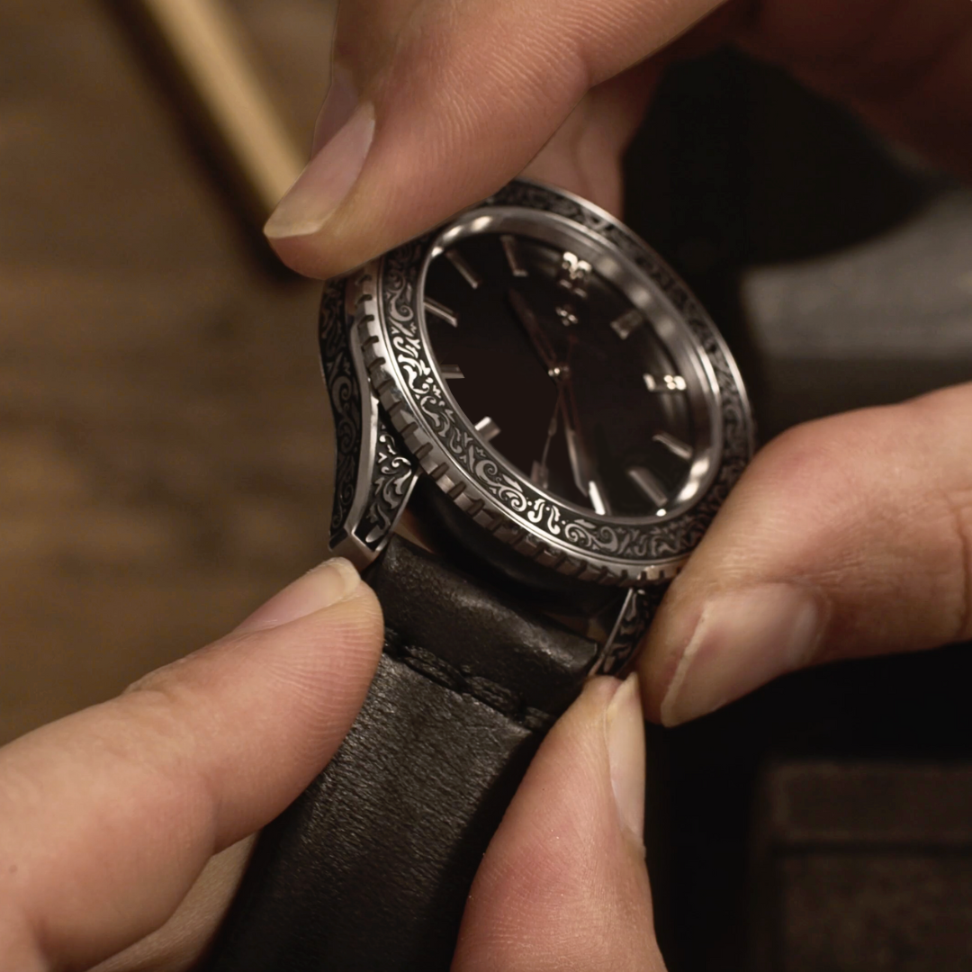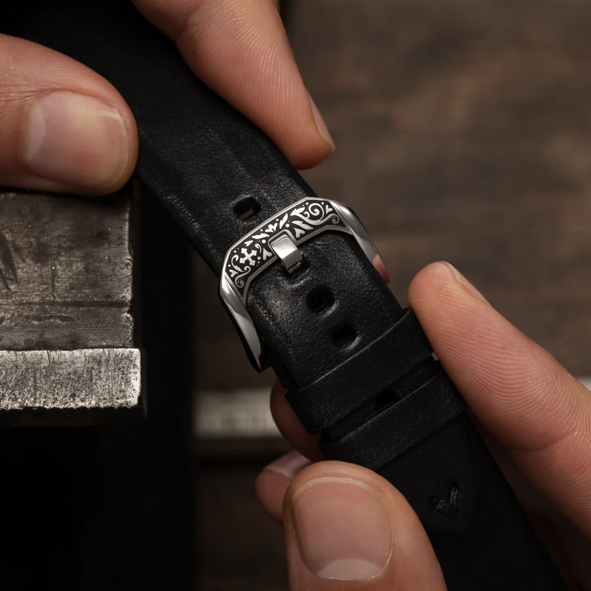 Eskitilmiş deri kayış, İtalya'nın en ünlü deri bölgelerinden biri olan Toskana'daki zanaatkârların ustalığıyla üretilmiştir. Fırça kullanılarak hafif aşındırmalarla gerçekleştirilen eskitme işlemi, deriye zarif ve yıllanmış bir görünüm kazandırır. Her parça elde işlenir ve zamanla doğal bir patina geliştirerek saatin karakterini güçlendirir. İncelikle işlenmiş toka ise kasanın dekoratif desenini yansıtır; böylece estetik bir bütünlük sağlanarak detaylara gösterilen titiz özen vurgulanır.