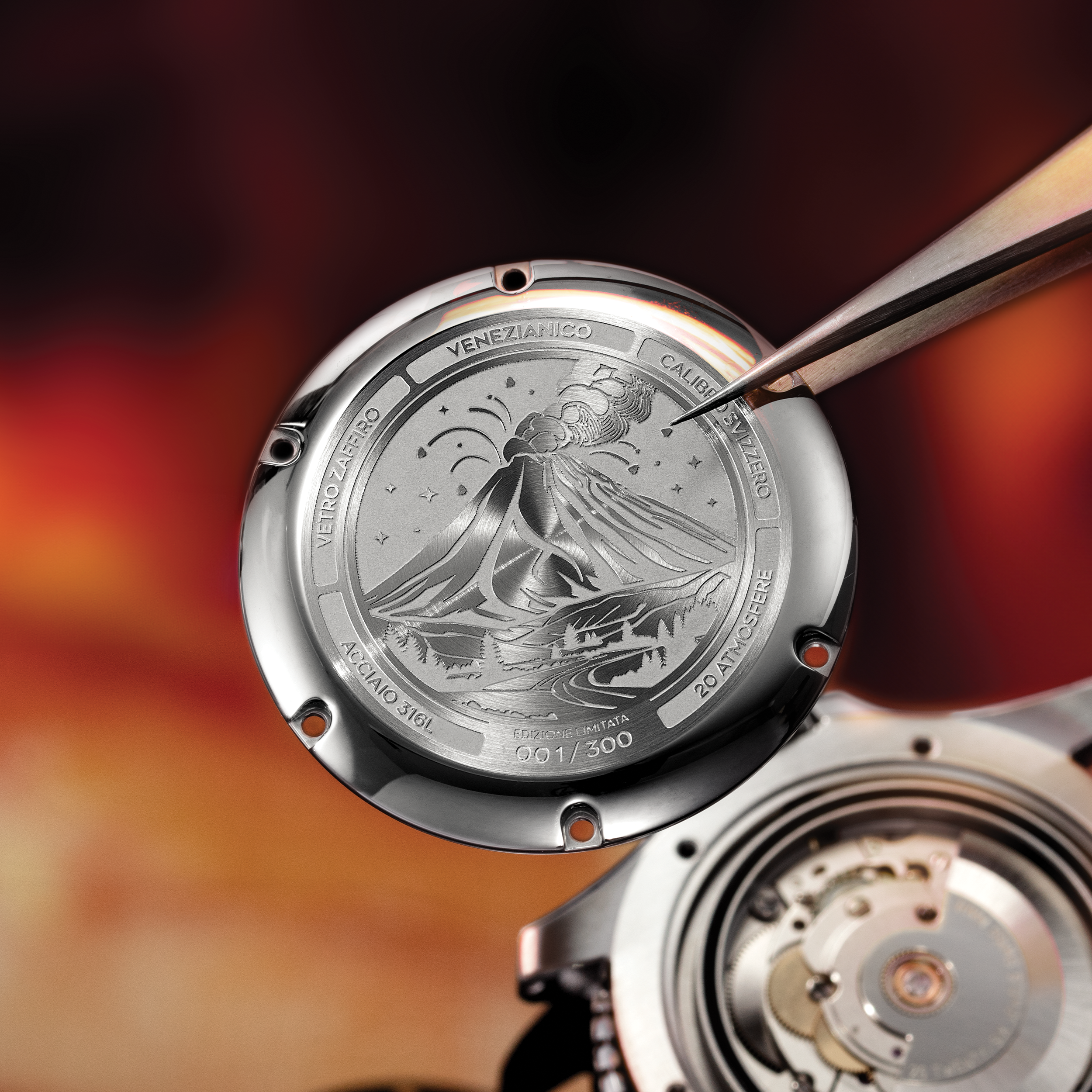Saatin arka kapağında, patlama anındaki bir yanardağı tasvir eden detaylı bir gravür bulunmaktadır. Bu ikonografik tercih, saatin tasarım konseptiyle doğrudan bağlantılıdır. Çünkü akik kadranın benzersiz çizgi ve renkleri, yanardağ oluşumlarını ve lavların kaya üzerindeki etkisini çağrıştırır. Alt kısımda ise, saatin sınırlı üretimdeki sıra numarasını belirten bir gravür yer almaktadır.