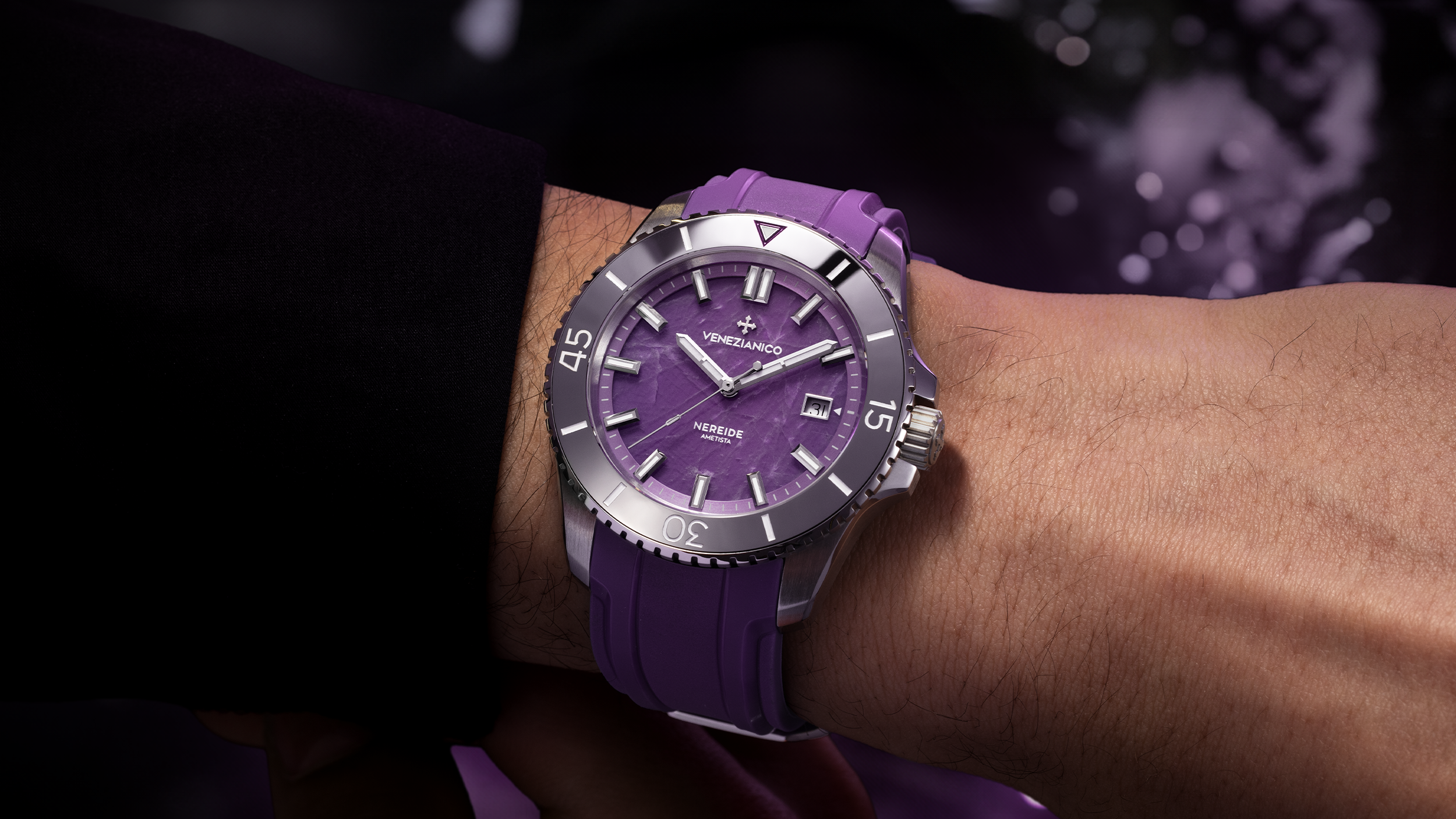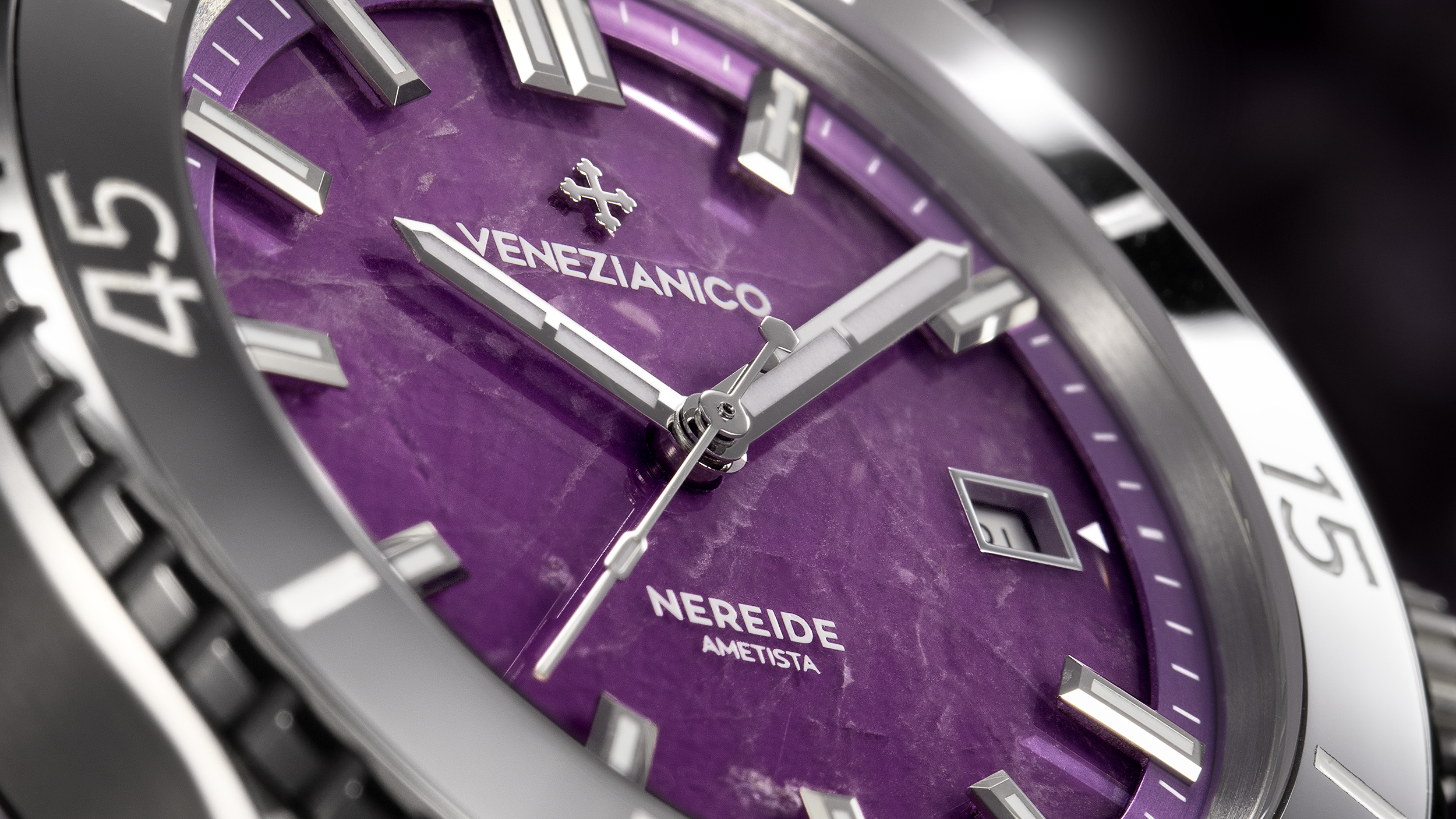Nereide Ametista, Venedik zanaat geleneğini modern malzemelerle birleştiren özel bir saattir. Mor ametist taşından yapılmış kadranı ve çizilmeye karşı dayanıklı tungsten bezeliyle dikkat çeker. 42 mm çapında paslanmaz çelik kasası ve 200 metreye kadar su geçirmezlik özelliğiyle hem şık hem de fonksiyoneldir. İsviçre üretimi Sellita SW200-1 otomatik mekanizmasıyla güvenilirlik sunar. Mor kauçuk kayışı, kadranla uyumlu bir görünüm sağlar.