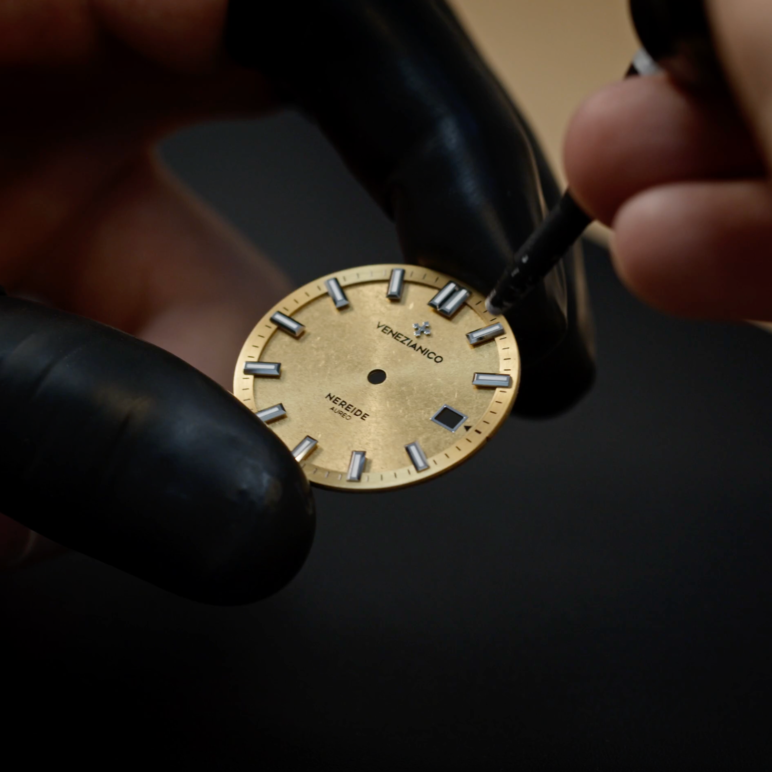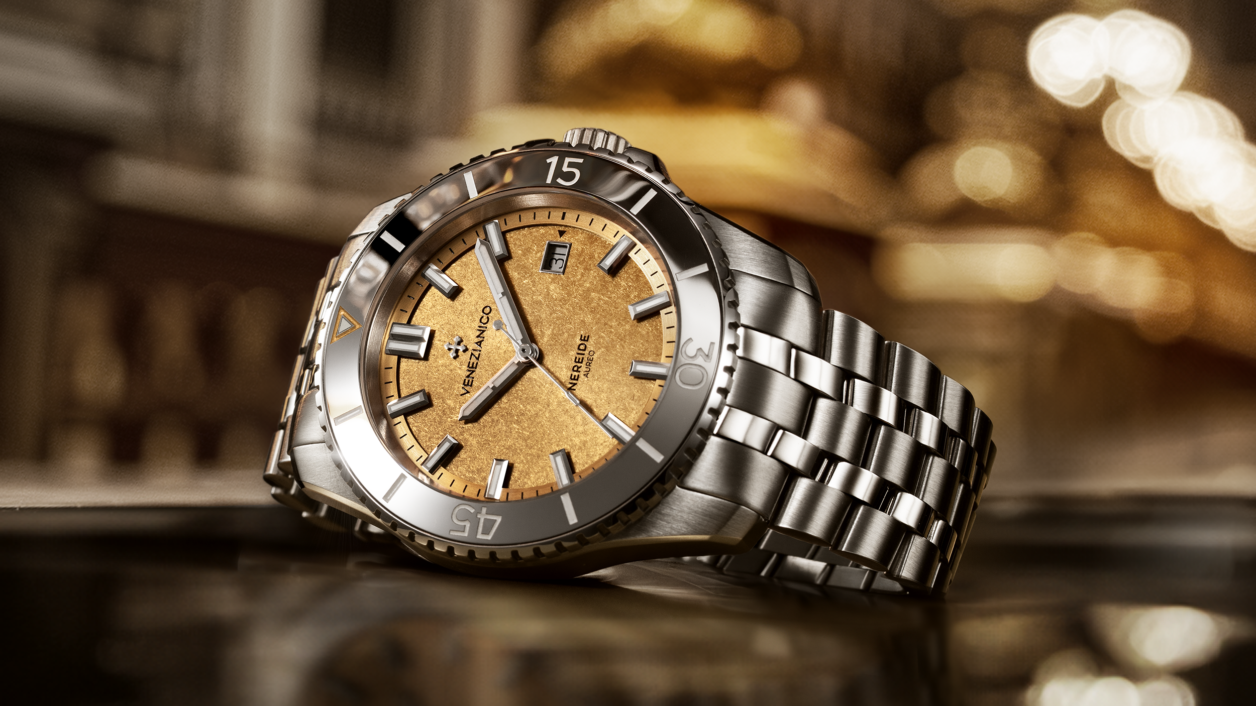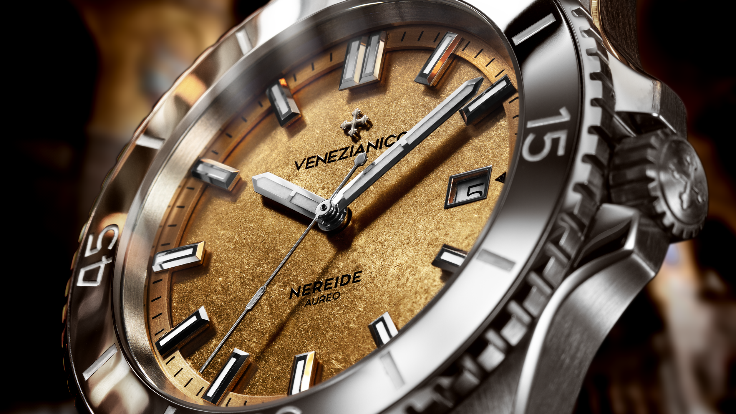 Nereide Aureo, zarafet ve yeniliği bir araya getiren bir dalış saatidir. Kadranı, 24 ayar saf altın kaplama ve dalgalı yüzeyiyle Venedik'in eski yaldız sanatını yansıtır. Dayanıklı 316L paslanmaz çelik kasa ve tungsten bezel, parlak ve saten bitişli bağlantılara sahip yeni Sansovino bileziğiyle kusursuz bir uyum içindedir. Mikro ayarlanabilir tokası, bilekte maksimum konfor ve dayanıklılık sağlar. 42 mm çapında ve 49 mm lug-to-lug ölçülerine sahip olan Nereide Aureo, 200 metreye kadar su geçirmezlik sunar. İsviçre yapımı Sellita SW200-1 otomatik mekanizmasıyla güvenilirlik sağlar. Arka kapağında, San Marco Bazilikası'nın ana nefi detaylı bir şekilde işlenmiştir; bu, Venedik'in zengin altın işçiliği geleneğine bir saygı duruşudur.