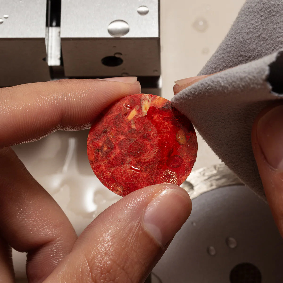 Sektörde sıklıkla tercih edilen tekdüze ve standart kadranların aksine, bizi farklılaştıran özgün bir üretim tekniği geliştirdik. Sürecimiz, mercan parçalarının titizlikle bir araya getirilmesiyle başlar; bu parçalar, mozaik kompozisyon yöntemiyle ustaca düzenlenerek bütüncül bir blok oluşturur. Bu yöntem, malzemenin doğal çeşitliliğini korur ve her bir saatin kendine has karakterini ön plana çıkarır. Ardından, mercan blokları su jeti teknolojisi ile hassas şekilde kesilir; bu yöntem, malzemenin bütünlüğünü koruyarak çatlak veya kusur oluşumunu engeller. Son aşamada ise her kadran özenle parlatılır ve ince mercan mücevherlerinde görülen zarif, üst düzey bir yüzey kalitesine kavuşturulur.