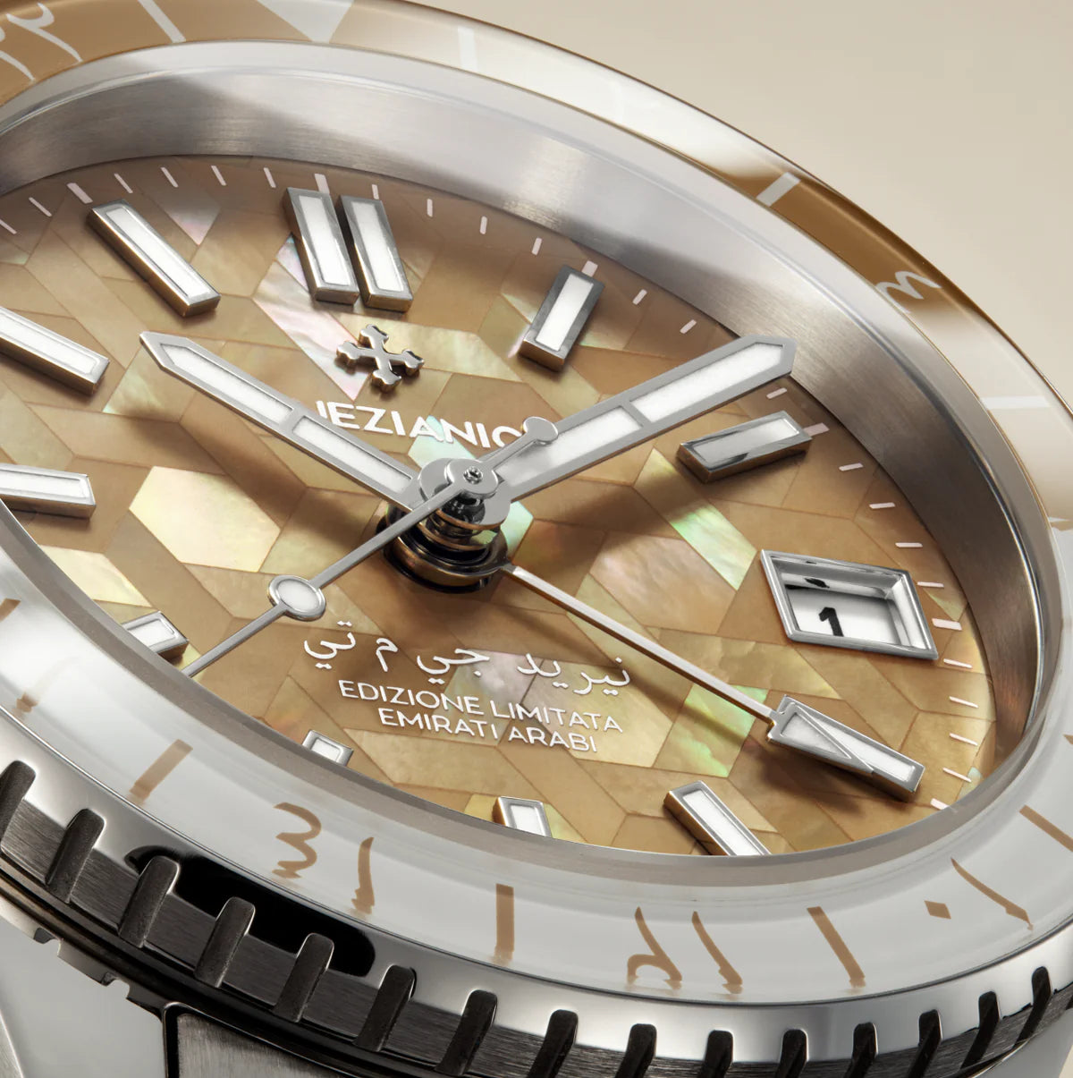 Bu konsept, Venedik ile Birleşik Arap Emirlikleri arasındaki kültürel etkileşimleri kutlar ve ülkenin zengin sanatsal mirasını sergiler. El yapımı sedef mozaik kadran, arabesk desenler ve Arap rakamlarıyla bezenmiş olan bu özel seri, zamansız geleneklerin zarafetini ve işçiliğini simgeler.