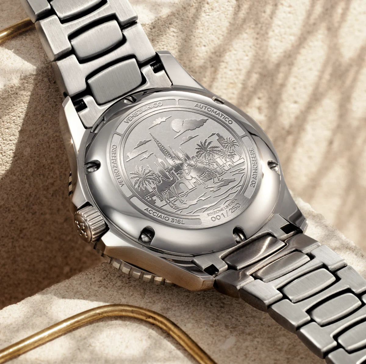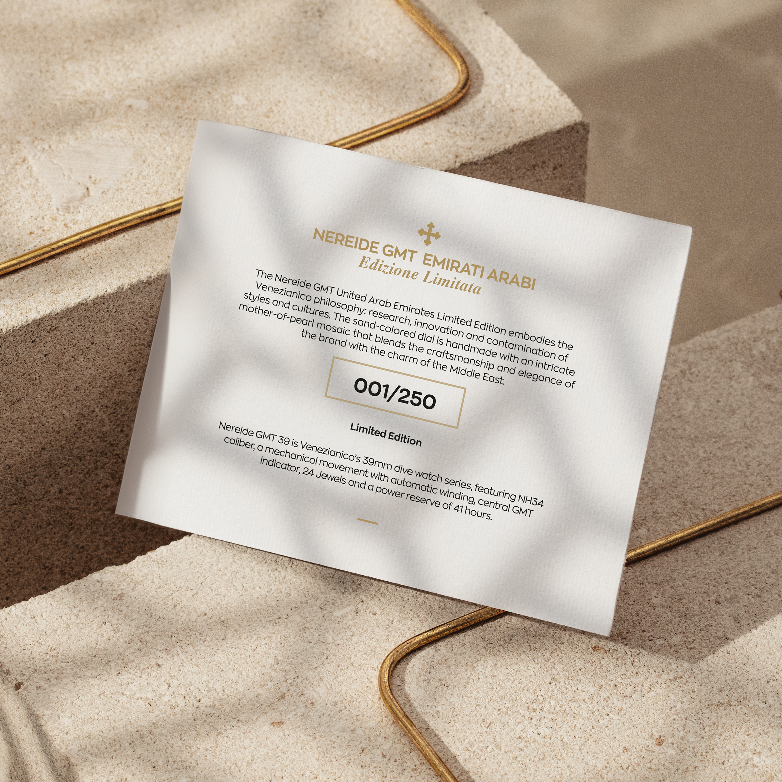 Bu 250 adet numaralandırılmış parçadan oluşan Sınırlı Üretim, Venedik'i yüzyıllar boyunca Doğu'ya bağlayan antik ticaret yolu İpek Yolu üzerindeki önemli bir durak olan Birleşik Arap Emirlikleri'ne saygı duruşunda bulunuyor. Arap geometrilerinden ilham alan kadranı ve el işçiliğiyle üretilmiş sedef mozaiği sayesinde, her saat benzersiz ve tekrarlanamaz bir parça haline geliyor.
