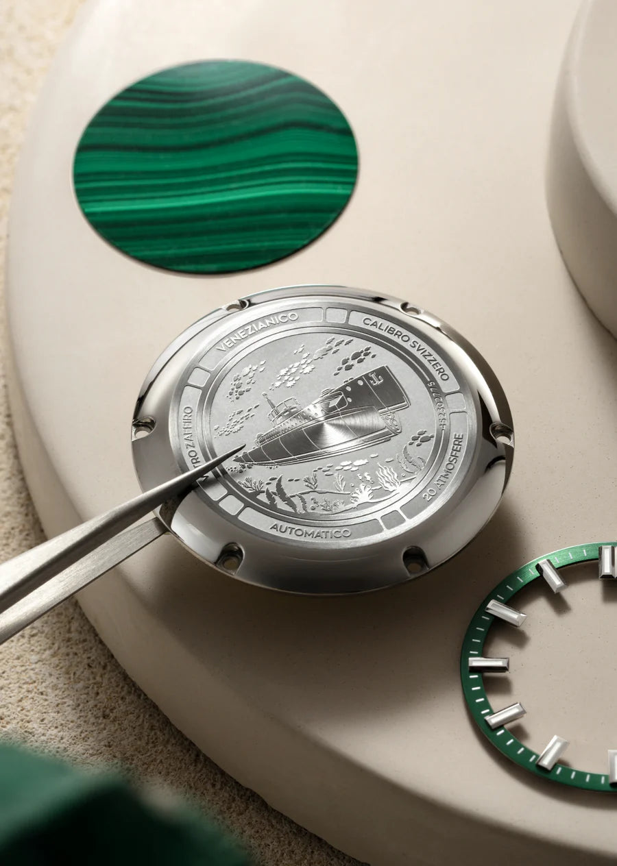 Tüm koleksiyona ilham veren Nereide denizaltısı, arka kapağın merkezinde hareket hâlinde, su altına dalmış şekilde tasvir edilmiştir. Bu detay, saatin su altındaki kararlılığını simgeler; 200 metreye kadar su geçirmezlik ve dalış sürelerini takip etmek için tasarlanmış döner bezeliyle güçlü bir performansı hatırlatır.