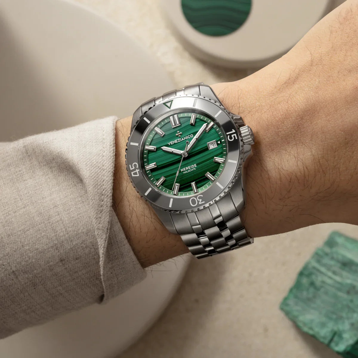 Nereide Malachite, doğal zarafeti ve üstün dalış performansını kusursuz bir şekilde bir araya getiriyor. Saatin merkezinde yer alan gerçek malakit kadran, kendine özgü yeşil tonları ve benzersiz çizgileriyle dikkat çekiyor—her kadran eşsizdir. 316L paslanmaz çelik kasası, çizilmeye karşı dayanıklı tungsten bezelle desteklenerek üstün sağlamlık sunar. Tasarımı tamamlayan Sansovino bilezik; parlak ve saten yüzeyli bağlantılarıyla öne çıkar ve mikro ayarlı tokası sayesinde bilekte ideal uyumu garanti eder.