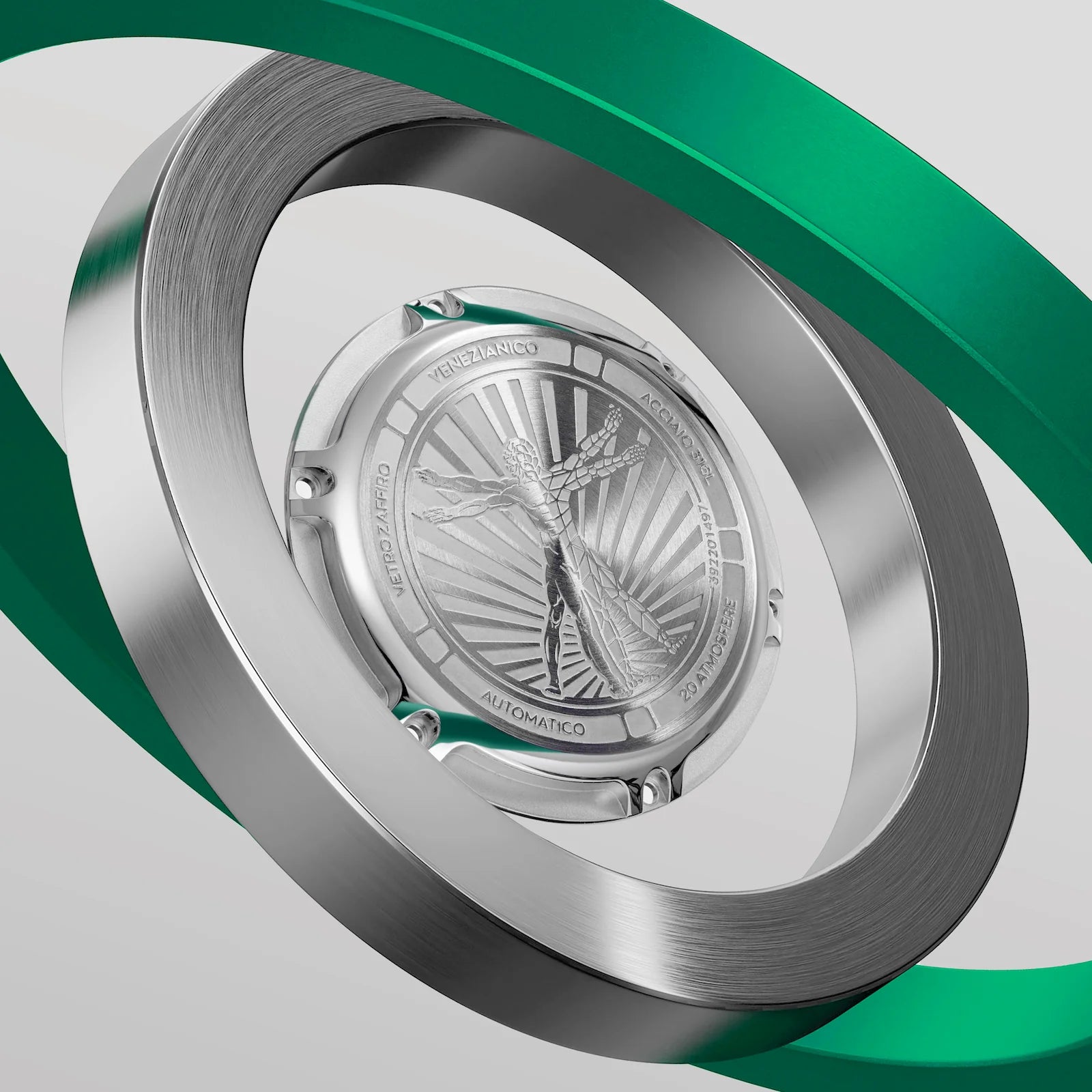 Nereide Ultraleggero’nun arka kapak tasarımı, saatin ardındaki mühendislik zekâsını görsel olarak yansıtmak üzere özel olarak kurgulanmıştır. Vida ve kanalların simetrik dizilimi, radyal saten finisaj, mikro kumlama ve parlak polisaj gibi üç farklı yüzey işlemiyle birleşerek hem teknik hem de estetik açıdan etkileyici bir sonuç sunar.