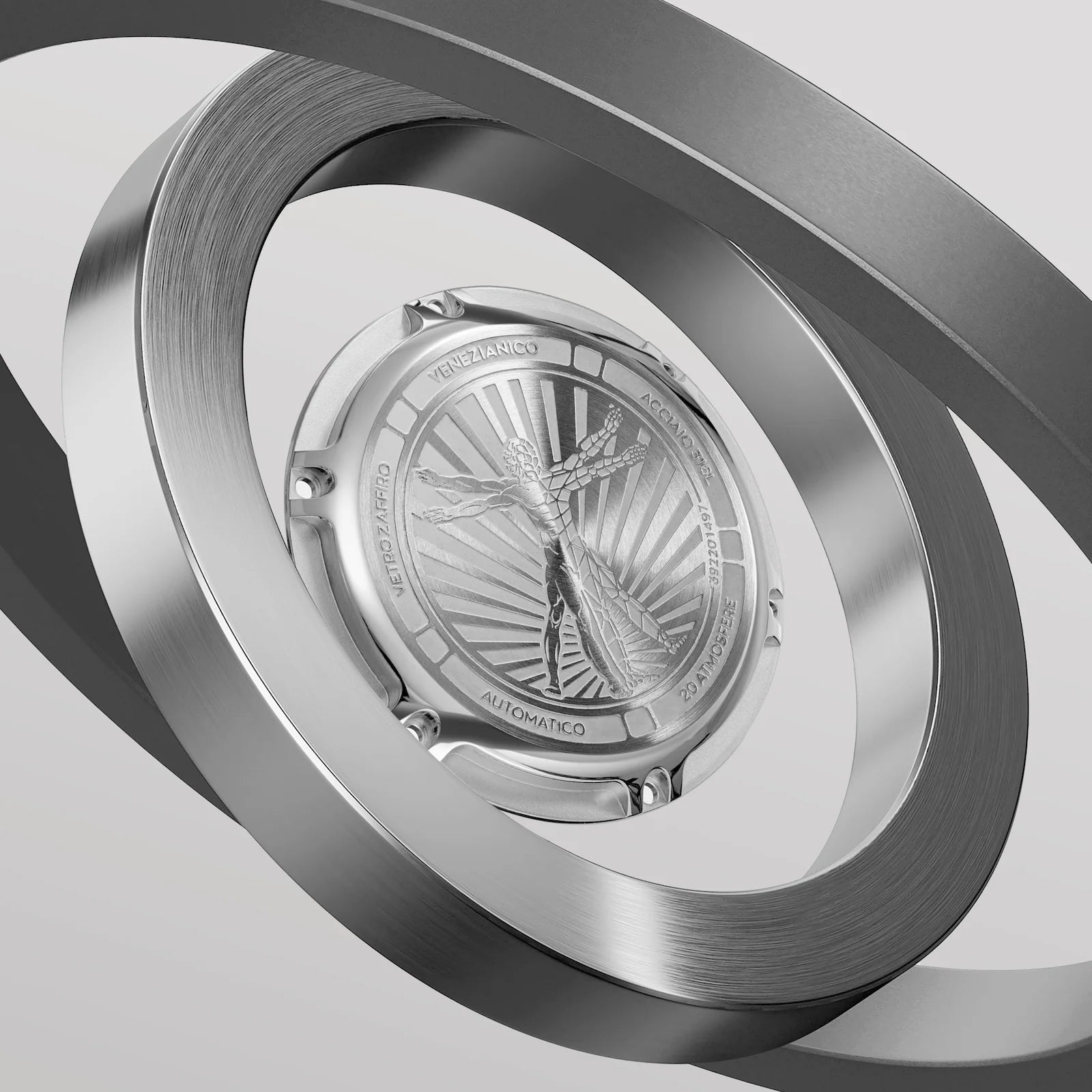 Nereide Ultraleggero’nun arka kapak tasarımı, saatin ardındaki mühendislik zekâsını görsel olarak yansıtmak üzere özel olarak kurgulanmıştır. Vida ve kanalların simetrik dizilimi, radyal saten finisaj, mikro kumlama ve parlak polisaj gibi üç farklı yüzey işlemiyle birleşerek hem teknik hem de estetik açıdan etkileyici bir sonuç sunar.