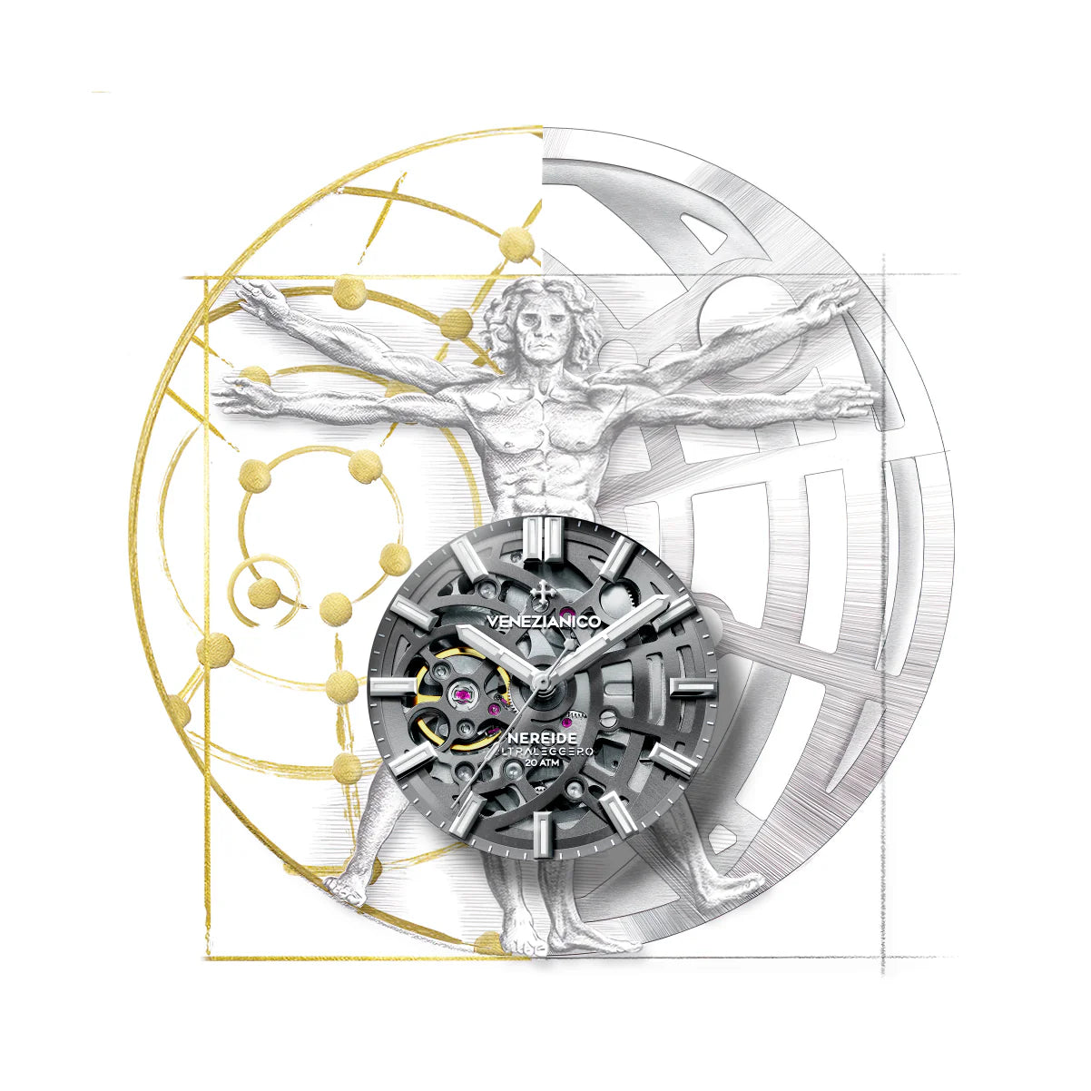 Ultraleggero, Nereide serisinin en yenilikçi saatidir. Tasarımında, Rönesans’ı ve sanat ile bilimin güçlü bağını simgeleyen Vitruvius Adamı’ndan ilham alınmıştır. İskelet kadranın özgün formu, patentli özel bir sistem sayesinde mekanizmanın gövdesiyle mükemmel bir uyum sağlar. Bu sistem, saate daha fazla hafiflik ve daha kompakt bir yapı kazandırır.