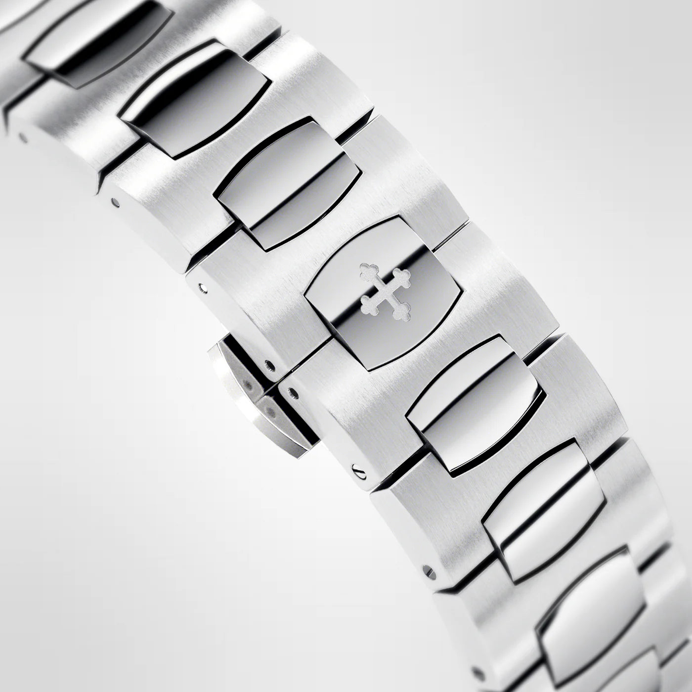 Bu kordonun üretimi için on altı farklı kalıp gereklidir ve tasarımı tescillenmiştir. Hem parlak hem de saten finisaj, kasa ile uyumlu olup, ortadaki bağlantıların öne çıkmasını sağlayarak zarafet ve denge sunar. Kelebek klipsi, son merkezi bağlantı ile mükemmel entegrasyonu sayesinde tasarımın devamlılığını bozmadan işlevselliği sağlar.