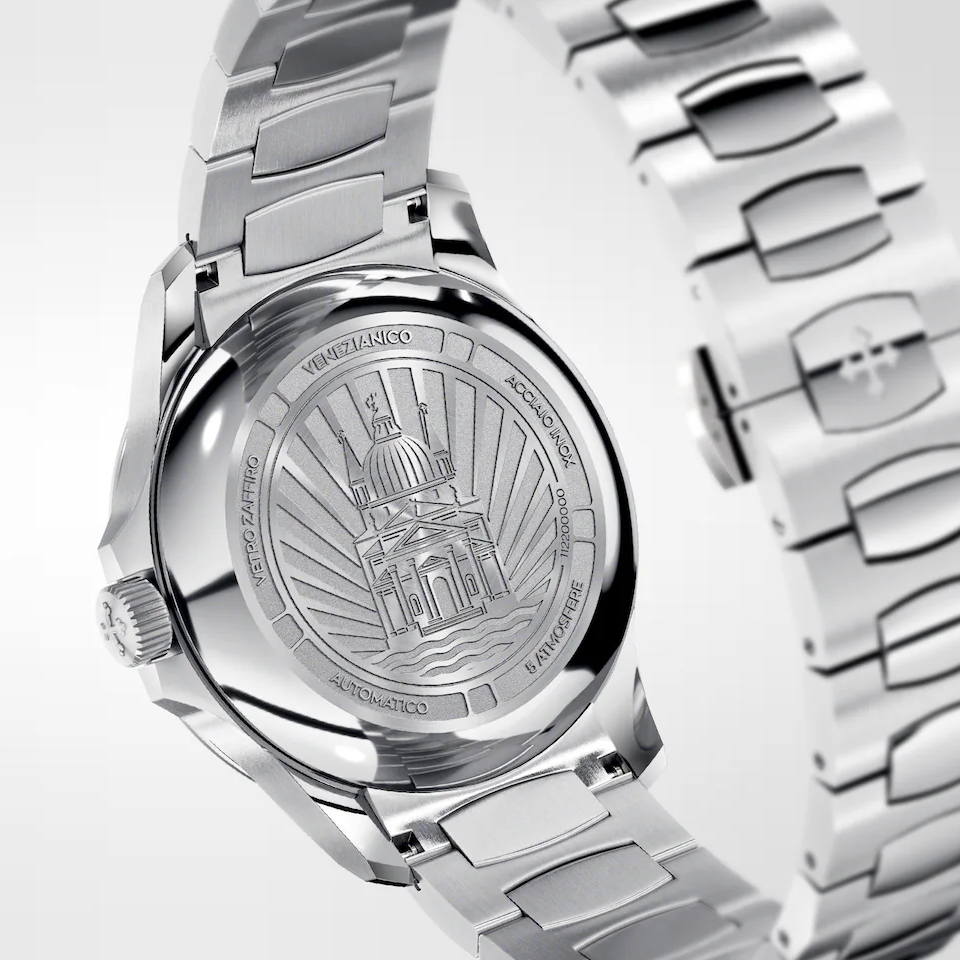 Redentore 36, daha küçük çaplı serisinin tipik özelliklerini koruyarak klasik ve zarif bir tasarım sunmak için vida kullanılmayan bir kasa arkasına sahiptir. Ortada, adını taşıyan bazilika gravürlü olarak yer almakta ve radikal saten finisajla süslenmiştir.