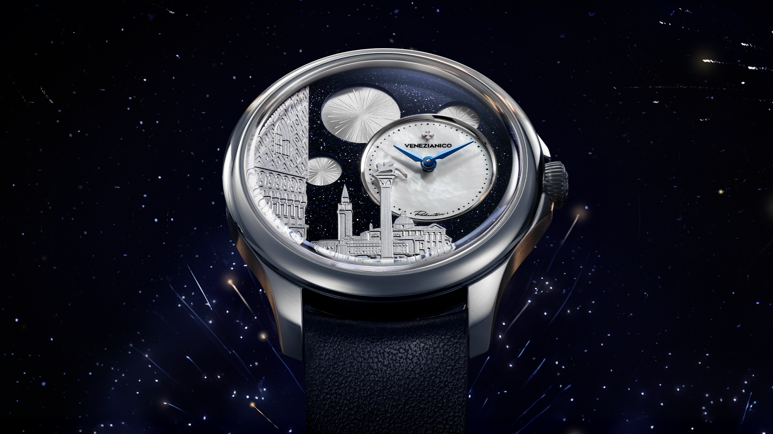 Bu yerleşim, sedef kadranı tasarımın geri kalanından ayrıştırarak, Redentore gecesinin büyüleyici atmosferinde San Marco Meydanı’nı tasvir eden arka planla etkileyici bir kontrast oluşturur.