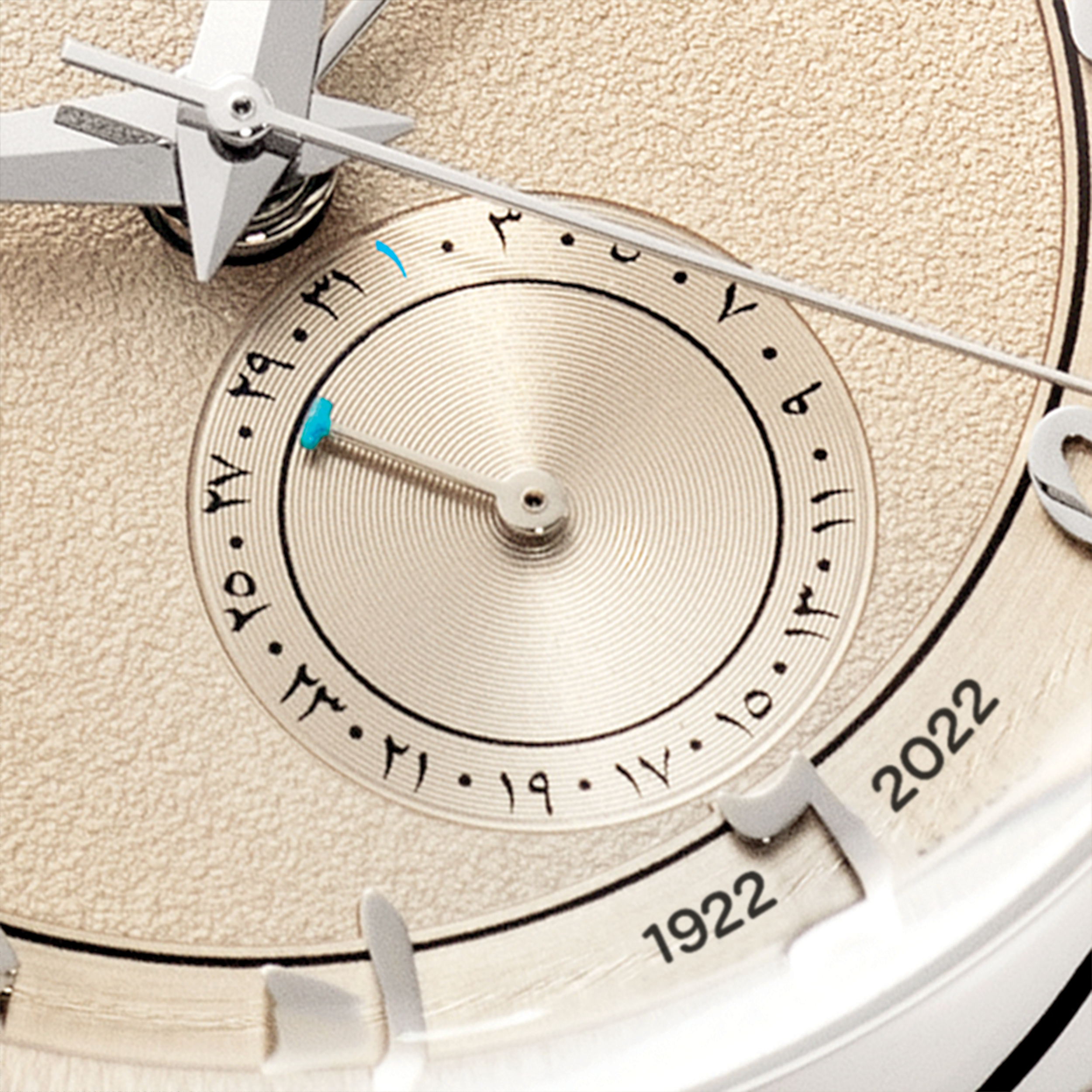 Çöl kumunu çağrıştıran grenli yüzey, saten dokulu chapter ring ve elle yerleştirilmiş Arap rakamları